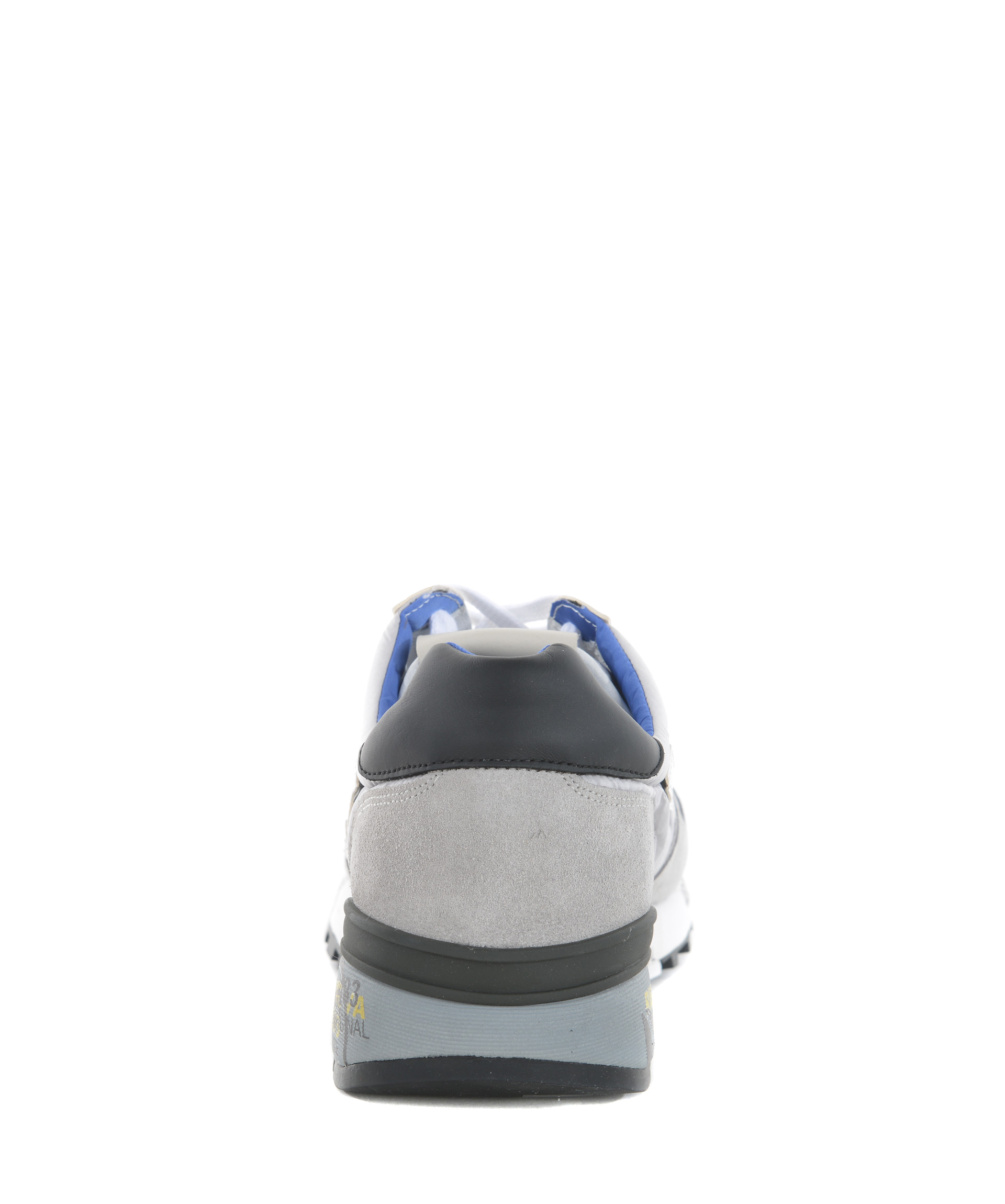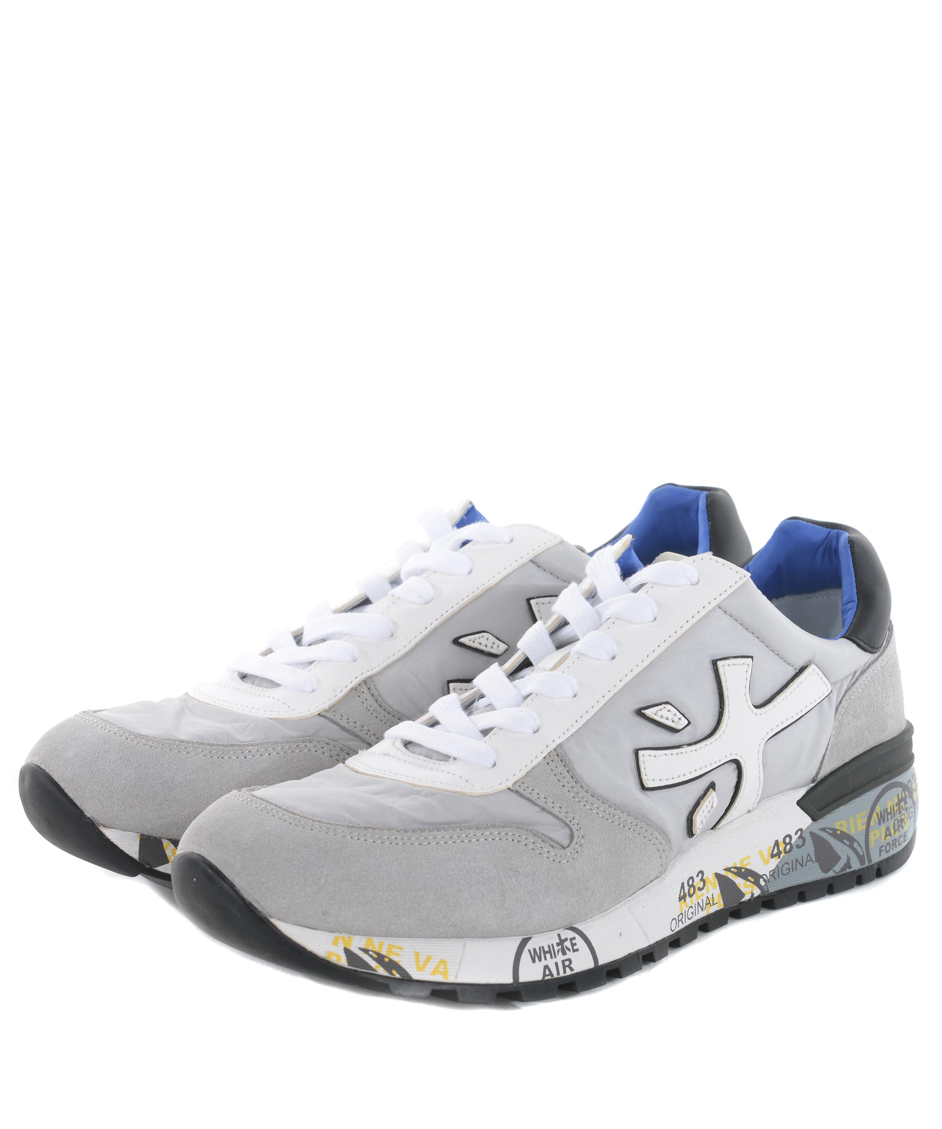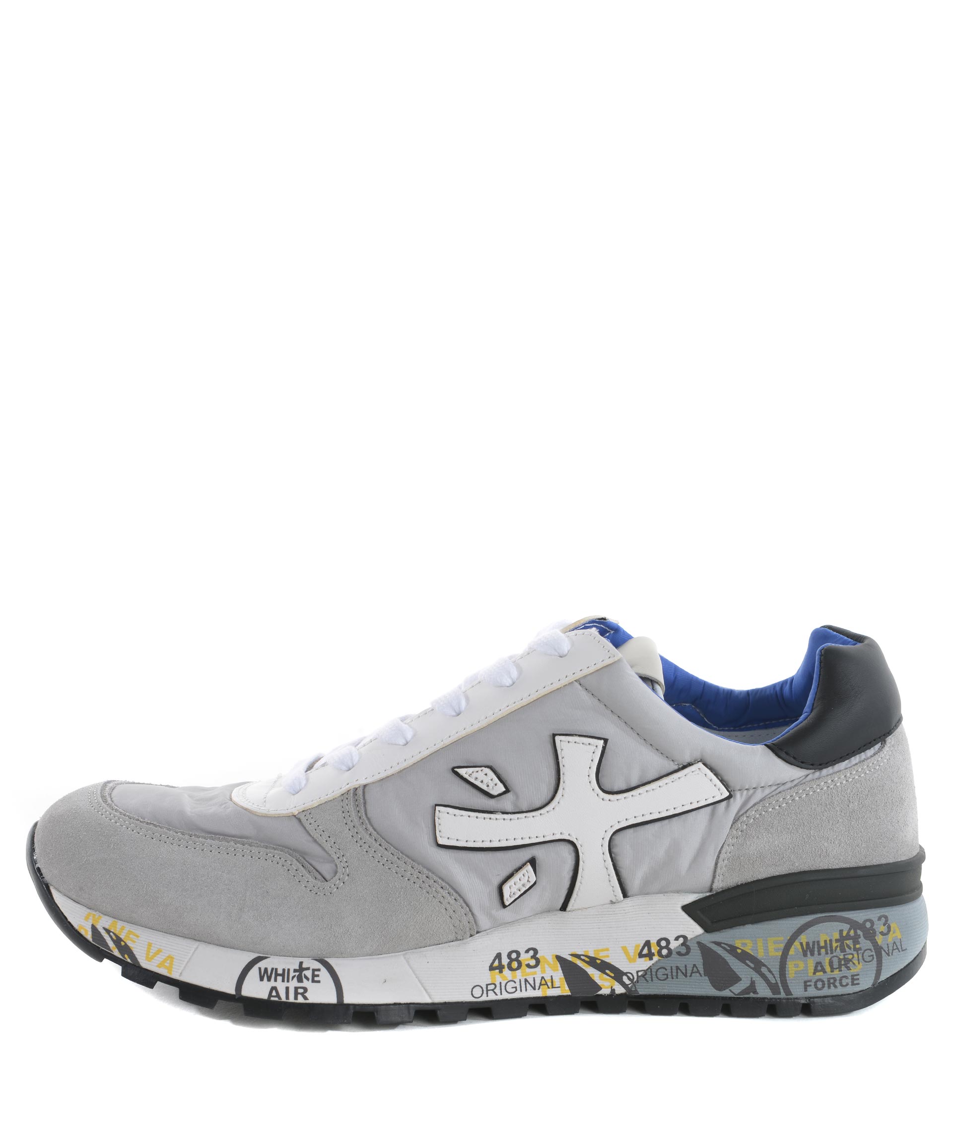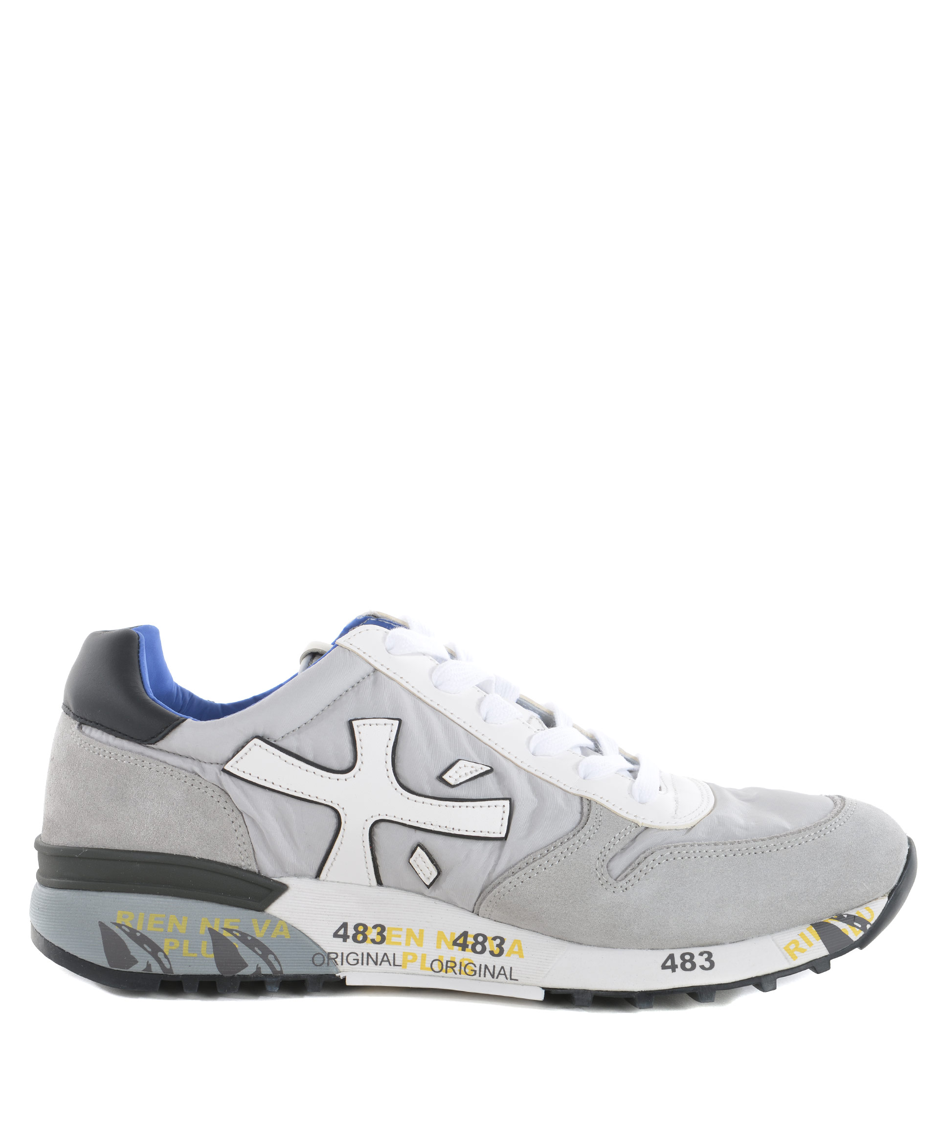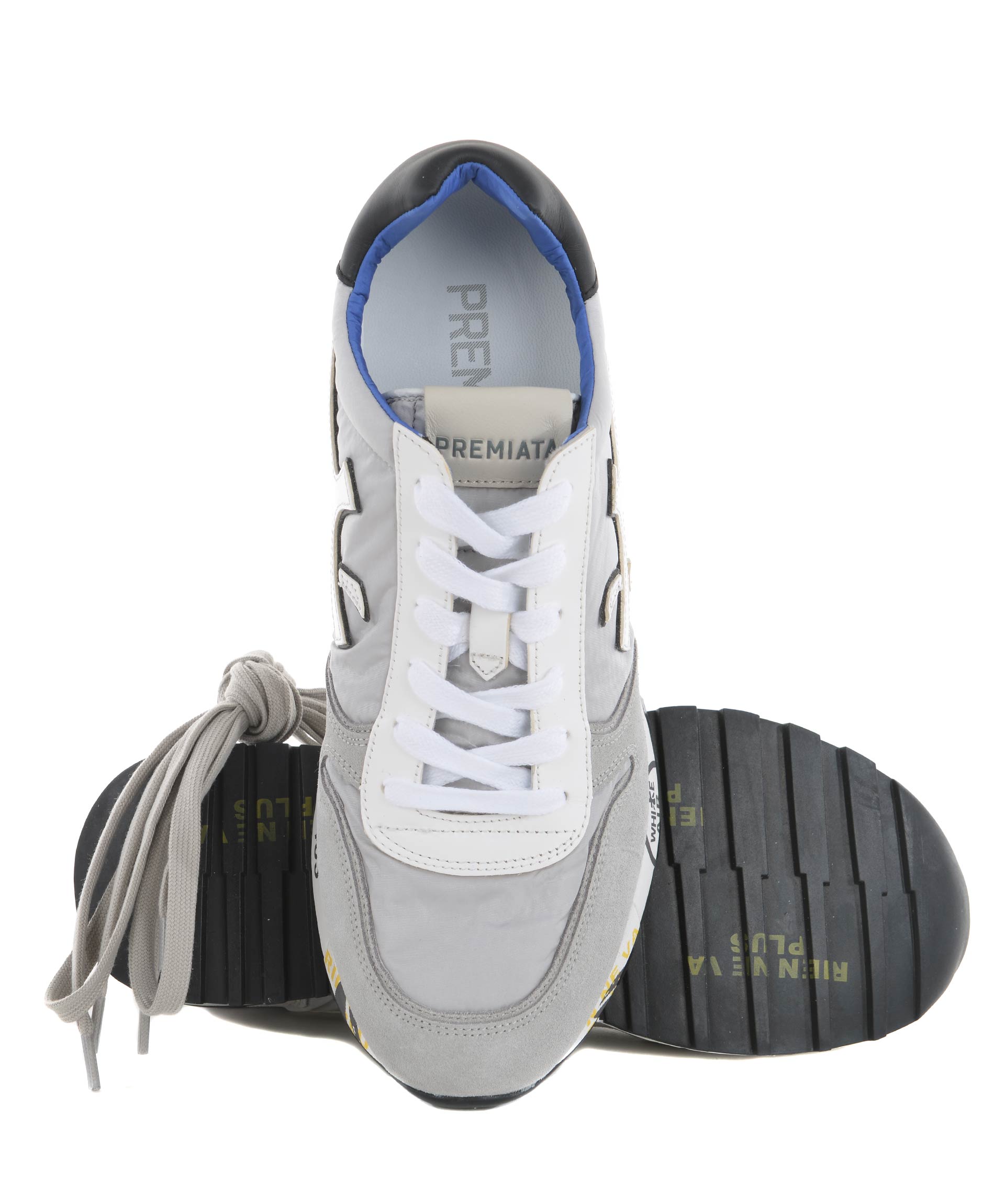 Sneakers uomo Premiata in camoscio e nylon Grigio chiaro. Inserti in pelle Bianca. Logo laterale in pelle. Stringhe di ricambio grigie. Suola 40 mm in gomma stampata. Misura in foto 41