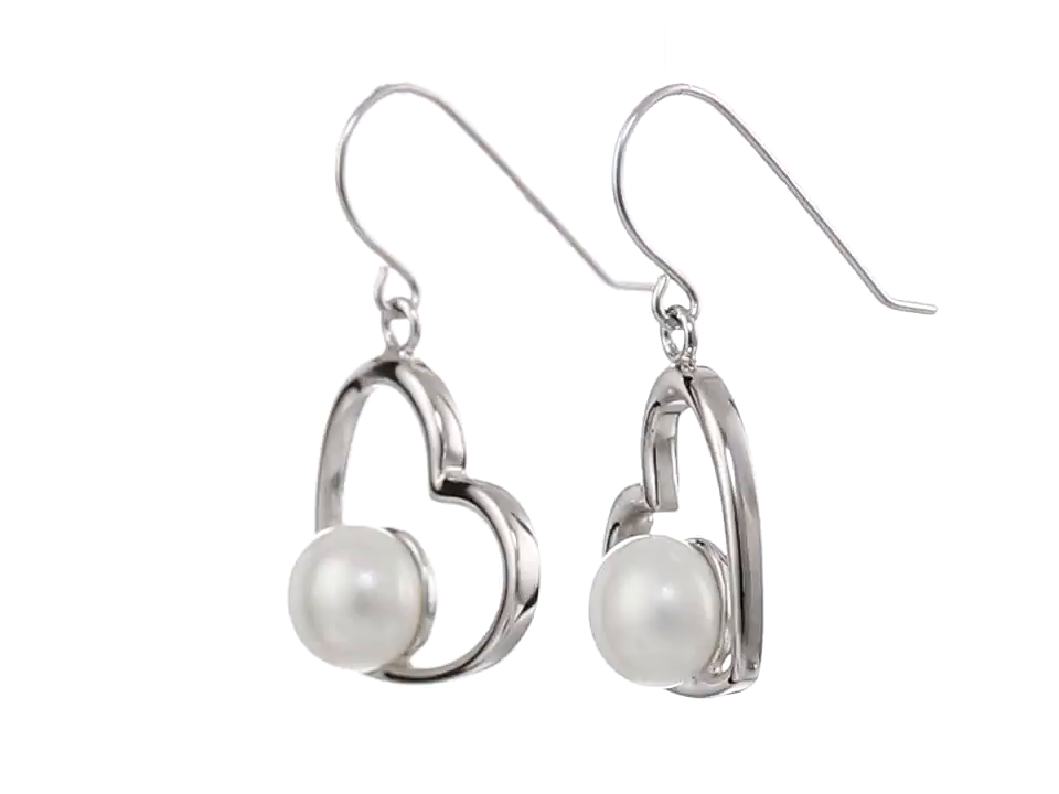 Sterling silver earrings with heart drops featuring 7-8mm freshwater-cultured pearl at center
