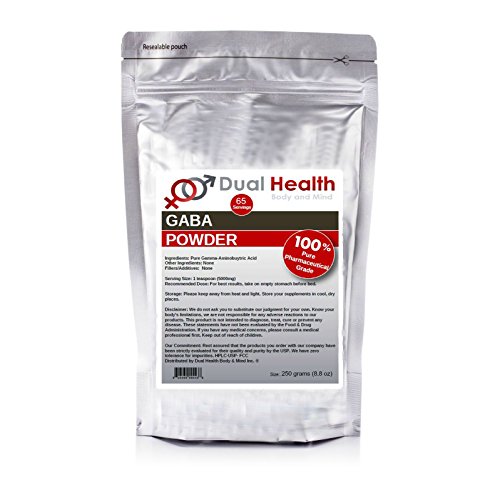-. Binding : Health and Beauty -. Brand : Dual Health Body & Mind -. Color : White -. EAN : 0634030188362 -. Feature : Guaranteed 100% Pure. No Fillers or Additives. / Zip Lock Factory Sealed For Freshness. / Lab Tested and Verified. / Pharmaceutical Quality Grade. / Free Shipping inside the USA. -. IsAdultProduct : 0 -. Label : Dual Health Body & Mind Inc. -. LegalDisclaimer : We do not ask you to substitute our judgment for your own. Know your body's limitations, we are NOT responsible for any adverse reactions to our products. This product is not intended to diagnose, treat, cure or prevent any disease. These statements have not been evaluated by the Food & Drug Administration. If you have any medical conditions, please consult a medical professional before buying. -. Manufacturer : Dual Health Body & Mind Inc. -. MPN : GABA Powder -. PackageQuantity : 1 -. PartNumber : GABA Powder -. ProductGroup : Health and Beauty -. ProductTypeName : HEALTH_PERSONAL_CARE -. Publisher : Dual Health Body & Mind Inc. -. Size : 8.8 oz -. Studio : Dual Health Body & Mind Inc. -. Title : Pure GABA (250 grams (8.8 oz)) Gamma Aminobutyric Acid Powder Bulk Supplements -. UPC : 634030188362