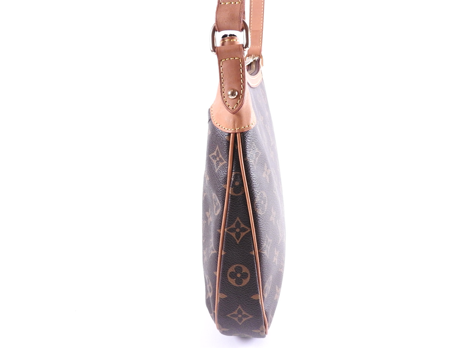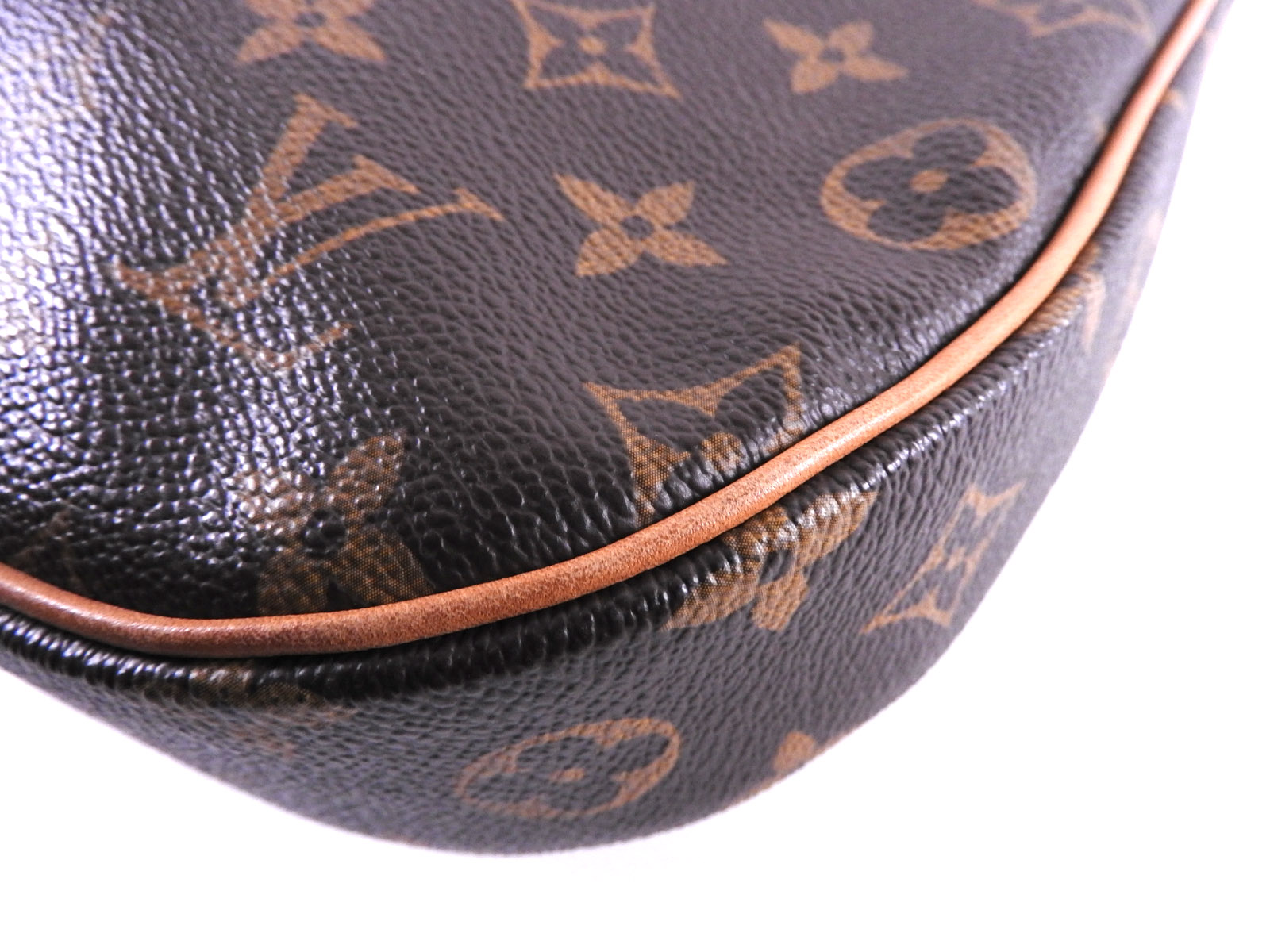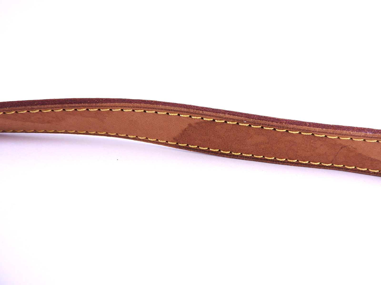 Monogram: Slightly used feeling. Slight fading. Leather: Used feeling. A few small scuffs, some stains and tanning. |