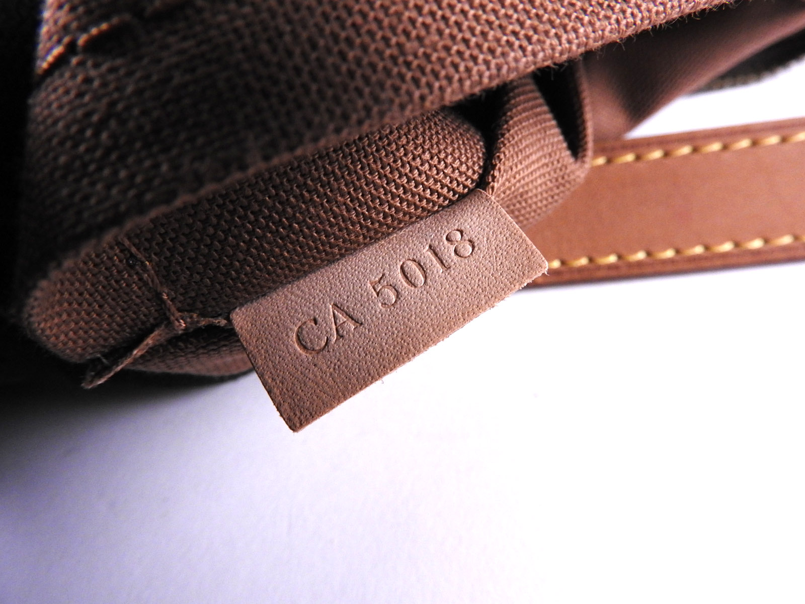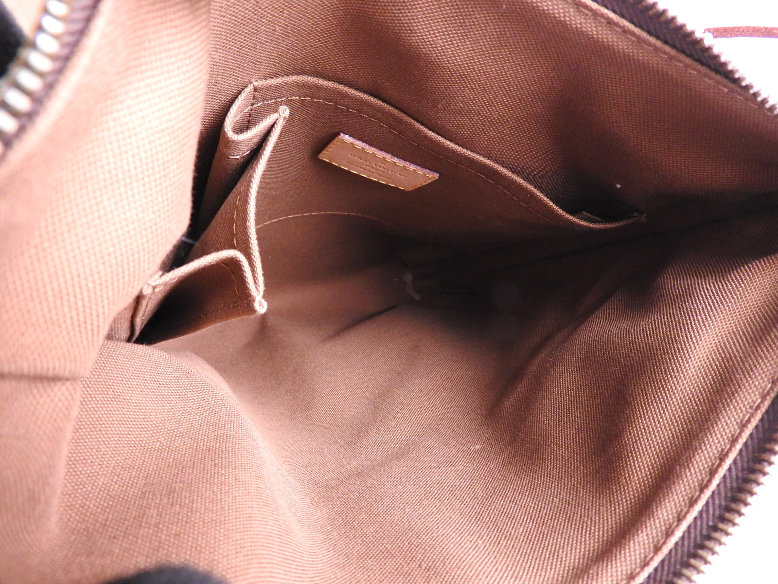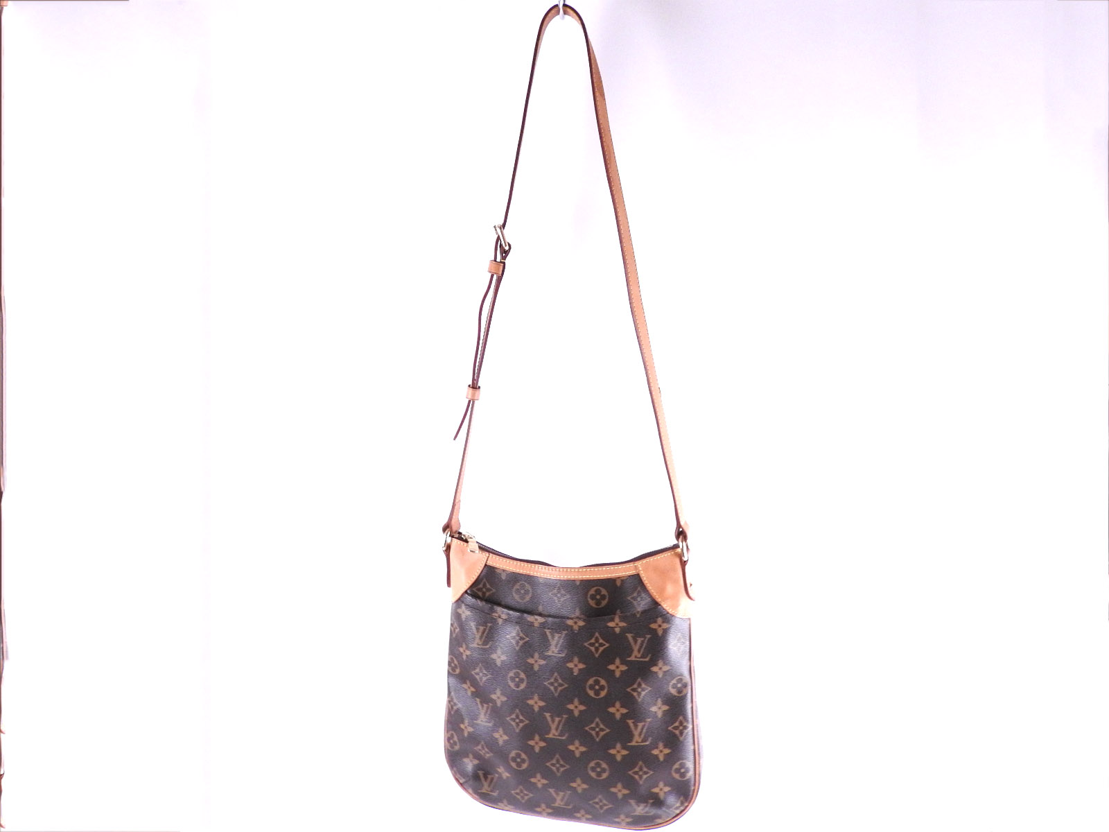 Monogram: Slightly used feeling. Slight fading. Leather: Used feeling. A few small scuffs, some stains and tanning. |