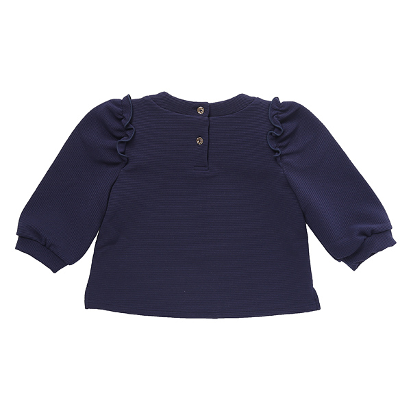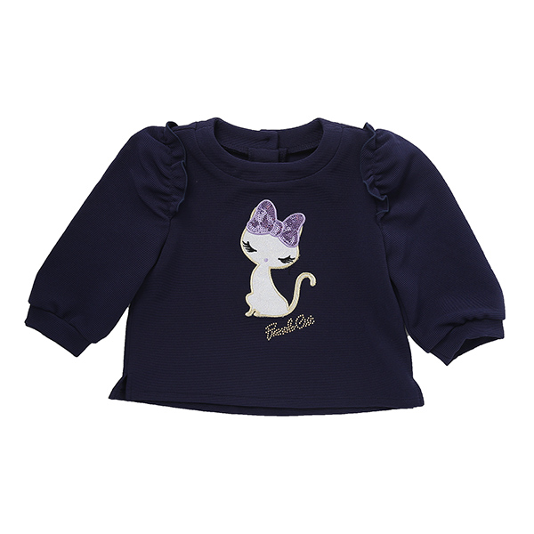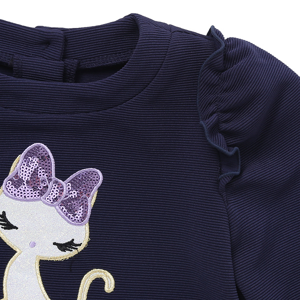 상품설명 네이비 퍼프소매 티셔츠입니다. 어깨라인을 따라 들어간 프릴과 봉긋한 소매라인이 잘 어울려서 사랑스러운 느낌을 주는데요. 리본달린 고양이로 브랜드의 아이덴티티를 더해주었습니다.