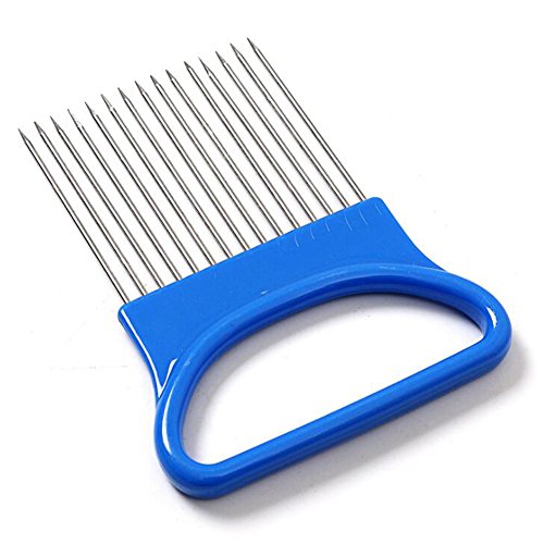 -. Feature : Color:Blue / Material:Plastic+stainless steel / Size(approx):10.6cm*7.8cm / Onion slicer guide has large comfortable handle designed to prevent cuts & scrapes / The onion holder is a very durable product and easy to clean