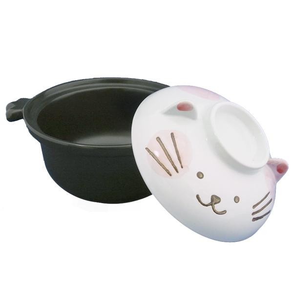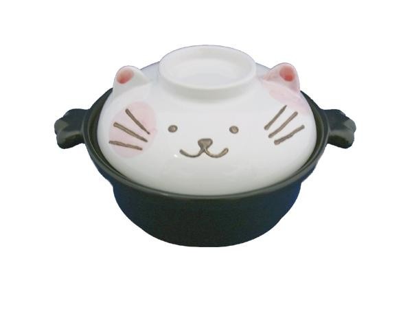 | 蓋が猫の顔になっている可愛い土鍋です。サイズが小ぶりで一人鍋としてちょうど良いサイズ!!鍋の持ち手部分も猫の手になっているこだわりデザインなので、猫好きな方へのギフトにもぴったりです。 |