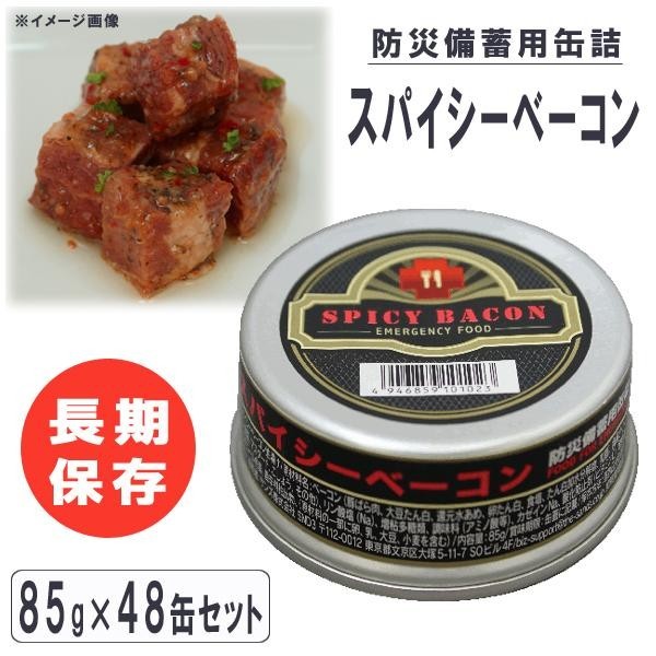 長期保存できるスパイシーベーコンの缶詰です。温めなくてもどこでもすぐに食べられる防災備蓄食です。 |