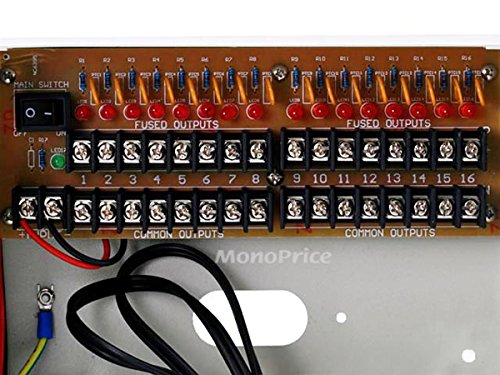 Powering multiple cameras could Not be easier! Monoprice's line of Professional CCTV Power Supplies give installers what they expect when it comes to power supplies quality and reliability. Every channel is protected with Auto-Reset PTC fuses which means these fuses will Not blow. This box can be mounted to any surface plugged into an AC outlet and up in seconds! Video Baluns (PID#6878) can easily be added by using DC Power Pigtails (PID# 6880) 12VDC - 10amp supply current Multiple outputs (16 channel) 16 auto-reset PTC fuse protected output Power on/off switch DC regulated over current and voltage protected Individual LED indicator for each out put Dimensions:25cm×21.3cm×9.5cm Fuse Rating: 1.1AFeature