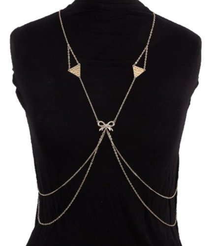 Product DescriptionBody Chain with bow with rhinestone: 1.1"x0.75" Gold color metal chain Lead nickel compliant0