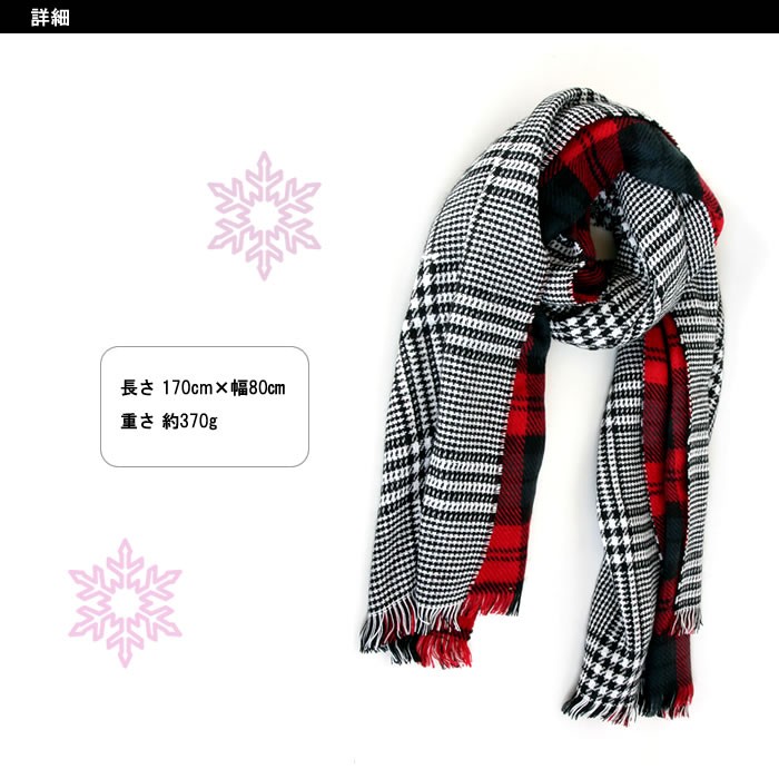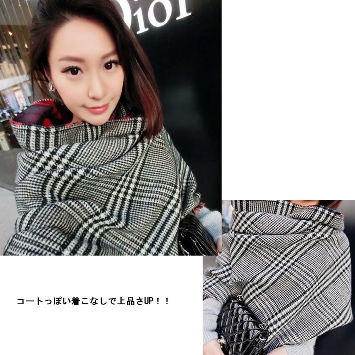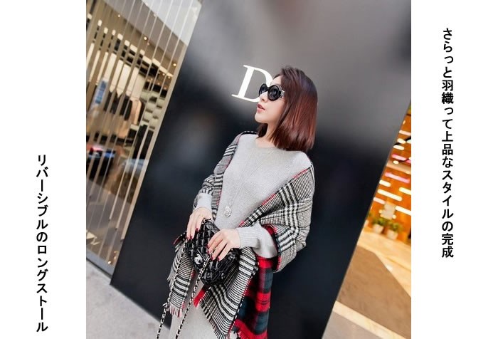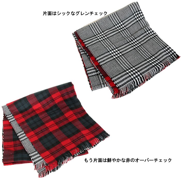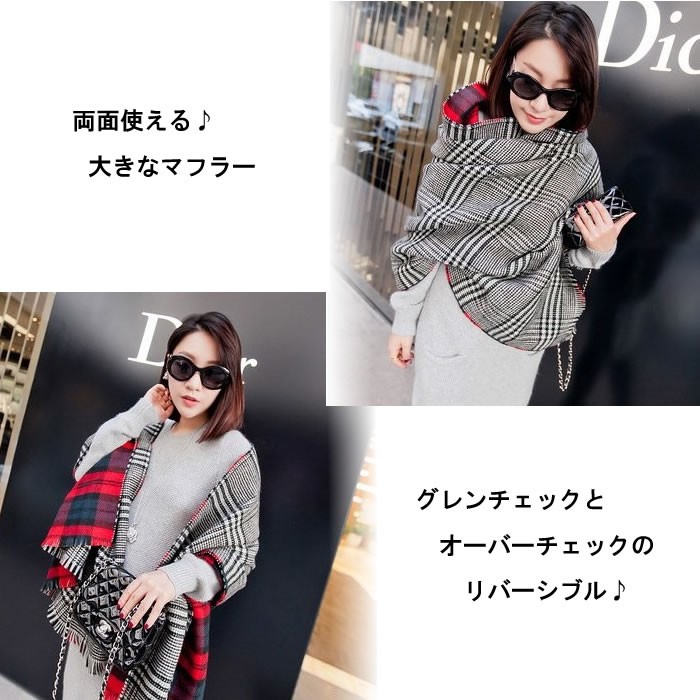 上品なグレンチェックと暖かな雰囲気のオーバーチェックのリバーシブル♪●単色になりがちな冬服のアクセントに最適♪上品な柄なので、お仕事着のアクセントにも♪ハードな服にもナチュラルな着こなしにもバッチリ似合う♪素材:アクリル(カシミヤタッチ)