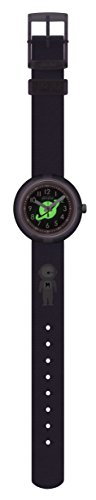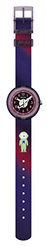 Flik Flak Space Dreamer Purple Dial Nylon Strap Unisex Watch ZFPNP024. 32 mm purple plastic case with a purple dial, a plastic crystal, green and white hands, and green Arabic numeral hour markers. Minute markers around the rim. Logo beneath the 12 o'clock position. Features: shock resistant, machine washable, BPA free, and glow in the dark planet on the inner dial. Hands: hours, minutes, and seconds. Case thickness of 9 mm. Push / pull crown. 14 mm purple nylon strap with an astronaut print on the lower strap. Buckle clasp. Quartz movement and water resistant up to 30 meters. Style: casual watches. Space Dreamer series.Feature