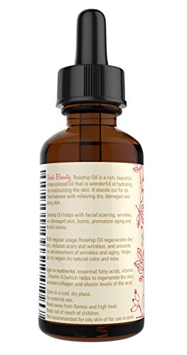 -. Feature : INVIGORATES your skin, hair and nails, each time you dab it on you'll start feeling more relaxed and rejuvenated 100% PURE cold pressed Rosehip Oil. No artificial ingredients or fillers in this bottle 4oz with premium glass dropper / ANTIOXIDANT properties boost skin elasticity and stimulate production of natural collagen, in turn preventing the formation of fine lines and wrinkles / FATTY ACIDS hydrate skin to relieve dry scalp and skin sensitivities such as eczema, acne and psoriasis / DIMINISHES scarring, stretch marks and other skin damage with Vitamins A and E, essential fatty acids and linolenic acids / ORDER today for satisfaction guarantee: If you're not satisfied with our Rosehip Oil for any reason, we'll refund your money, no questions asked.