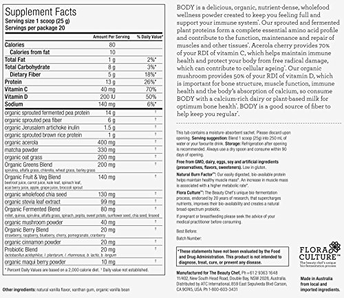 -. Feature : Packed With Three Clean Sources Of Bio-Available Plant Proteins, Superfruits, Vegetables, Alkalizing Greens + Probiotics, Body Remains The Same Super-Charged, Superfood Wellness Supplement You Know & Love - Now With The Added Benefits Of Pure Matcha Green Tea / The All Natural, Vegan Formula Boasts A Range Of 25 Organic (95 Percent Certified Organic) Fermented Whole Foods / Supercharged With The Beauty Chef's Unique Flora Culture Bio-fermentation Process, Which Bio-Activates & Magnifies The Nutritional Value Of The Ingredients While Making Them More Available For The Body / No Synthetic Amino Acids, Artificial Colorings, Flavorings, Preservatives, Lactose, Soy Or Dairy / 17.6 oz / 500 g