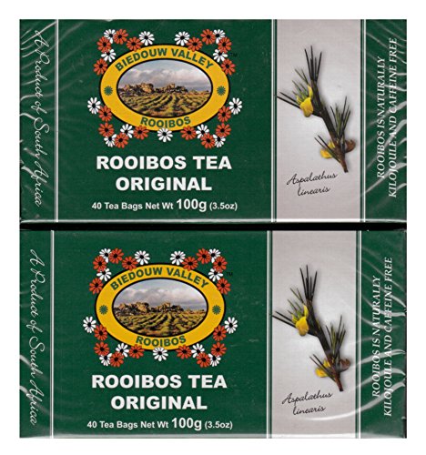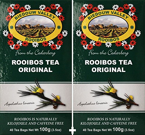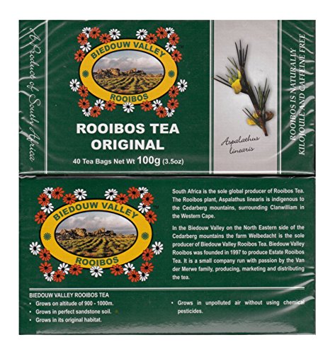 -. Binding : Grocery -. Brand : Biedouw Valley Rooibos -. IsAdultProduct : 0 -. Label : Biedouw Valley Rooibos -. Manufacturer : Biedouw Valley Rooibos -. ProductGroup : Grocery -. ProductTypeName : GROCERY -. Publisher : Biedouw Valley Rooibos -. Studio : Biedouw Valley Rooibos -. Title : Biedouw Valley Rooibos Tea: Original. South African Red Bush Healthy Herbal Tea - Caffeine and Calorie Free; Antioxidant & Mineral Rich. Grown At High Altitude In Natural Habitat.