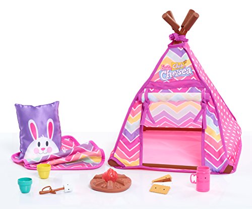 Studio : unknown Publisher : unknown Binding : Toy Product Description Explore the great outdoors in style with the Barbie Club Chelsea Camping Set! This fabulous set is compatible with all 14" Club Chelsea dolls (sold separately). Chelsea's trendy tent comes in the shape of tee-pee and features colorful patterns that match her pillows and blankets! Help Chelsea roast marshmallows over the camp fire and then make s'mores with the play graham crackers and chocolate! Chelsea can cook a hot meal over the fire with the pink frying pan and serve herself a comforting cup of coco in her cute portable thermos! A true glam-ping experience! Full set includes: One tee-pee tent, one light-up campfire, two marshmallow sticks, one s'more, one frying pan, one dinner tray, two pillows and two blankets. Doll sold separately. Ages 3 0