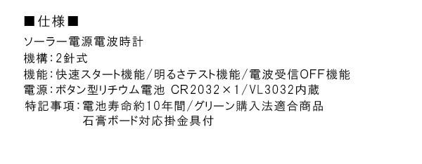 | ソーラー電源仕様で寿命長持ち。また快速スタート機能、明るさテスト機能付です。インテリア空間に馴染むシンプルなデザインでありながらも細身の木枠と文字リングでさりげなく個性を主張する時計です。 |