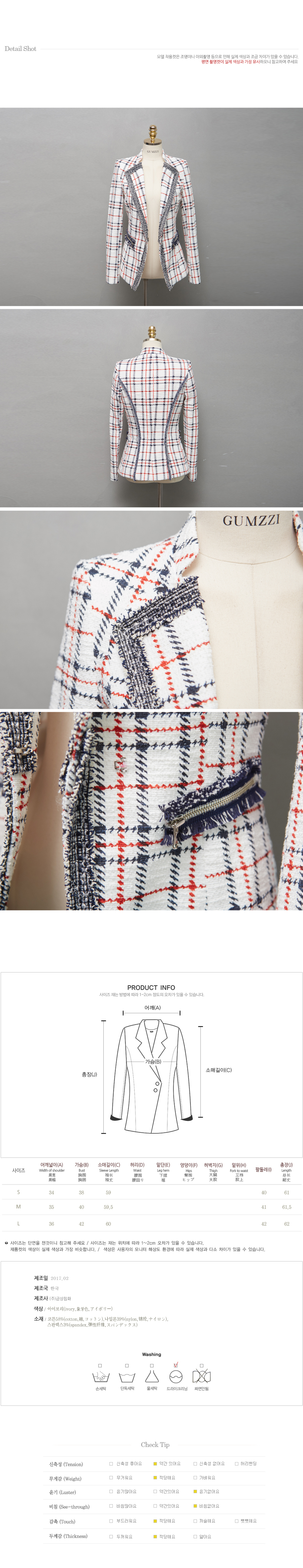 메르빌 자켓 [jk5042] 고급스러운 메르빌 자켓을 소개해드려요 ~ 세련되면서 럭셔리한 무드를 완성하여 보시기 좋은 자켓 제품이에요~ 핏감, 봉제, 소재 무엇하나 빼놓을수 없는 아이템인데요. 고급스럽게 입기 좋은 메르빌 자켓입니다 S/S에 오피스룩으로 하객룩이나 모임룩으로도 전혀 손색이 없으며 팁 매칭에 따라 데일리하지만 시크한 감성으로 즐기기에도 너무나 좋답니다. 가성비 대비 퀄리티가 너무 좋구요. 금찌에서 고객님들 눈높이에 최대한 맞췄답니다. 메르빌 자켓 고객님들께 강력 추천해드려요. model 착용 사이즈 : S(44-55) 세리 모델은 S 사이즈를 착용했어요~^^44~55(S) 55~66(M) 66~77(L) 착용하실 수 있어요.