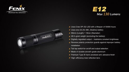 2 Pack Fenix E12 CREE XP-E2 130 Lumen LED flashlight with two EdisonBright AA alkaline batteries. E11 upgrade