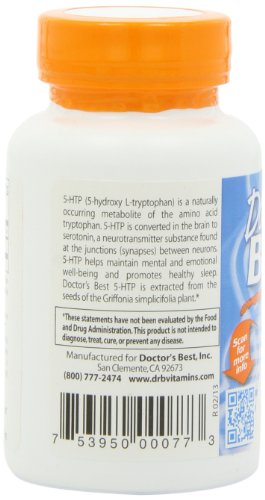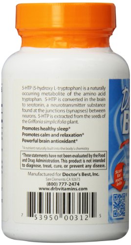 -. Binding : Health and Beauty -. Brand : Doctor's Best -. Label : Doctor's Best -. Manufacturer : Doctor's Best -. PackageQuantity : 1 -. ProductGroup : Health and Beauty -. ProductTypeName : HEALTH_PERSONAL_CARE -. Publisher : Doctor's Best -. Studio : Doctor's Best -. Title : Doctor's Best Best 5-HTP, 100 mg Vegetarian Capsules