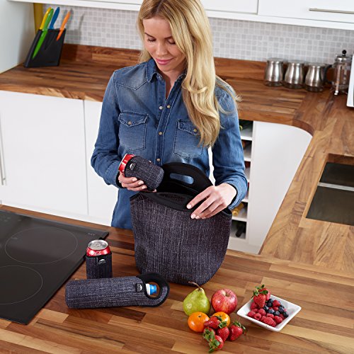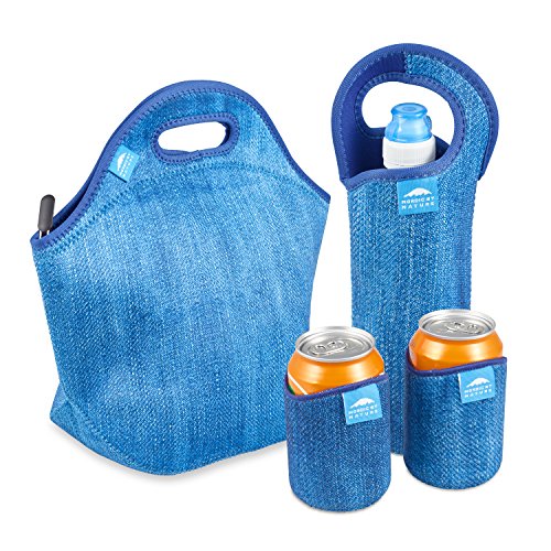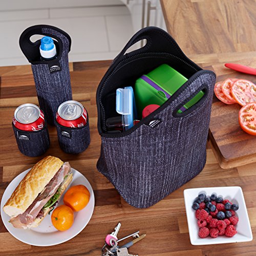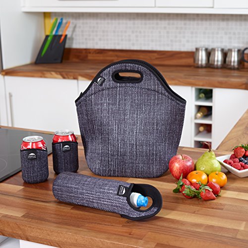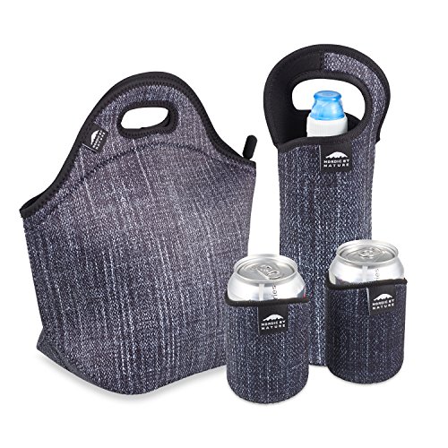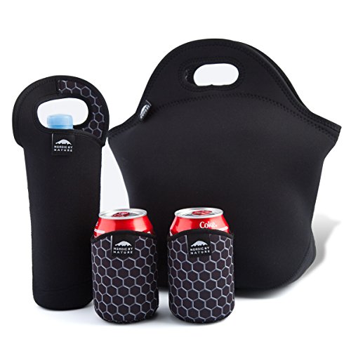 Chill your lunch for up to 6 hours with our extra-thick, 4mm Insulated Neoprene Lunch Set. Chic, convenient bundle includes XL roomy bag for lunch & separate sleeve for water bottle and two can coolers.