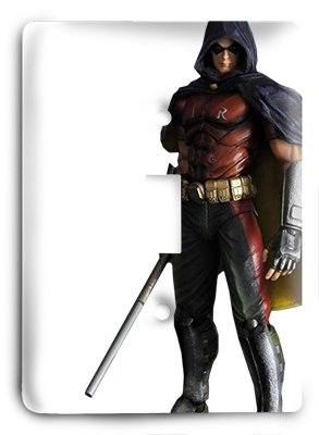 -. Brand : Single Light Switch Cover -. EAN : 0746839354494 -. Feature : Metal Long Lasting (not plastic) / Baked On - Non Fading / Great Image. / Home Improvement / Decorate an Office, Bar, use as Room DŽcor -. Label : Home Accents -. Manufacturer : Home Accents -. MPN : 0746839354494 -. PartNumber : 0746839354494 -. ProductGroup : Art and Craft Supply -. ProductTypeName : ART_AND_CRAFT_SUPPLY -. Publisher : Home Accents -. Studio : Home Accents -. Title : Arkham Robin - Batman DC Comics Light Switch -. UPC : 746839354494