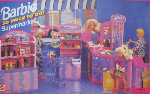 -. Feature : Barbie So Much To Do! Supermarket is a 1996 Arcotoys, Mattel production, made in Hong Kong. / INCLUDES: Big Shelving Unit, Small Shelving Unit with Freezer, Weighing Scale, And Pretend Poly Bag Dispenser, Check-Out Counter with Cash Register, Credit Card Checker, And Magazine Rack, Shopping Cart, Shopping Basket, Pretend Canned Food Items, Pretend Boxed Food Items, Pretend Frozen Food Items, Pretend Fruits and Vegetables, & Instructions. / Box approx. 19" x 12-1/4" x 2-1/2". All included items are Pretend & Intended for Barbie & other 11.5" Fashion size Dolls; NO DOLLS included. Playset can be used with other size dolls, as preferred. / For Ages 3+ Years. All sizes, colors & details are provided to the best of my ability & may not be exact & may vary. / *NEW & NEVER ASSEMBLED -Box previously OPEN. For Box Condition see CONDITION NOTE or Email Seller for Details.