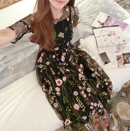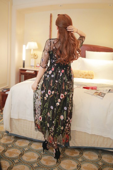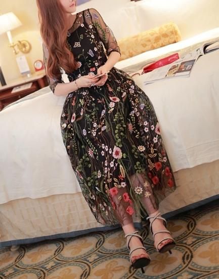 花柄刺繍レースのシースルーロング丈ワンピース。