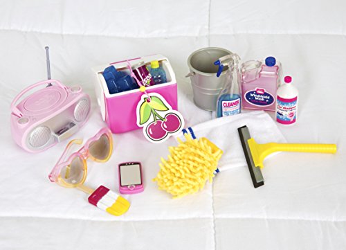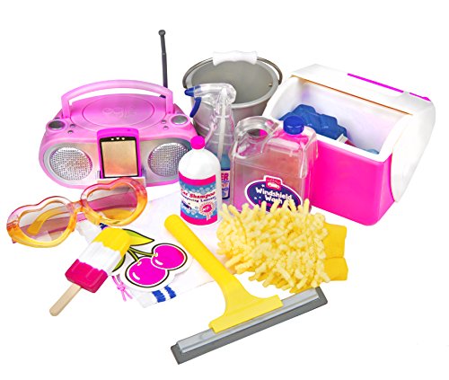 INCLUDES 15 PLAYABLE ACCESSORIES This play set comes with 1 washing mitt, 1 cloth, 1 boombox, 1 phone, 1 set of ice cubes, 1 popsicle, 1 soda can, 1 water bottle, 1 pair of sunglasses, 1 bucket, 1 window squeegee, 1 spray bottle, 1 bottle of windshield washer, 1 bottle of car shampoo, 1 air freshener.