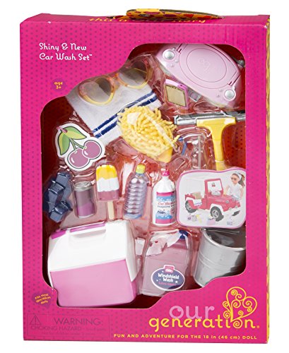 KEEP YOUR RIDE SPARKLY AND CLEAN Keep your Retro Convertible, 4x4 or any other Our Generation Doll accessory sparkly clean with the Shiny and New Car Wash Set. It includes tons of accessories for a fun day with your girlfriends soaking up the sun and getting a little wet!