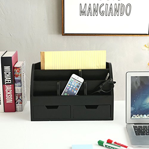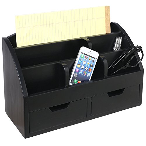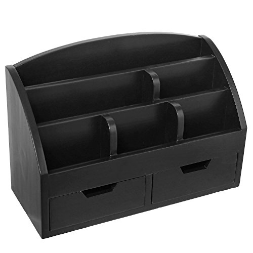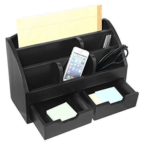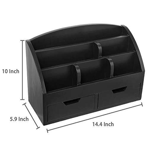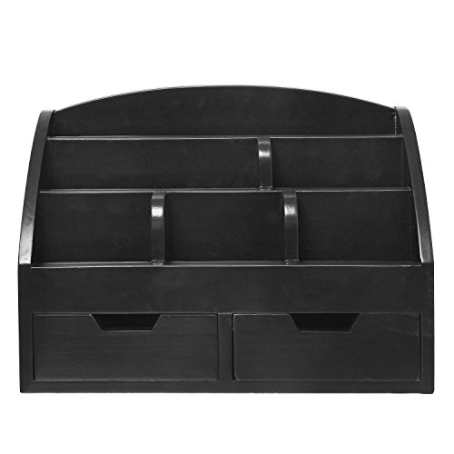 Modern Wood 6-Compartment Desktop Organizer, 2-Drawer Office Supplies Desk Caddy, Black