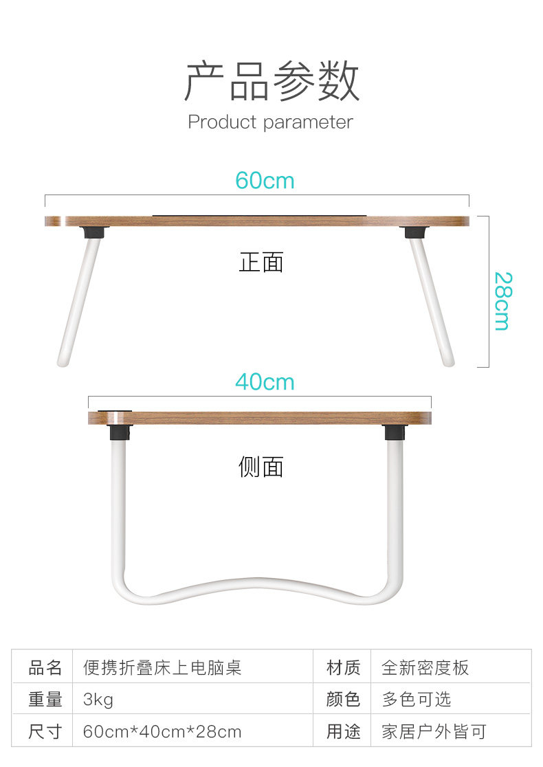 Pre-marketable: No Whether the assembly: the whole assembly Style positioning: economical Gross weight: 3.1kg Applicable scene: laptop desk Foldable: Yes Whether roller wheel: No Style: Simple and modern Material: Wood-based panel Wood-based panel types: other Whether with cooling: No Desktop is adjustable: not adjustable Can be customized: No