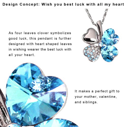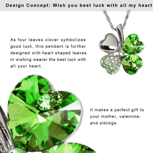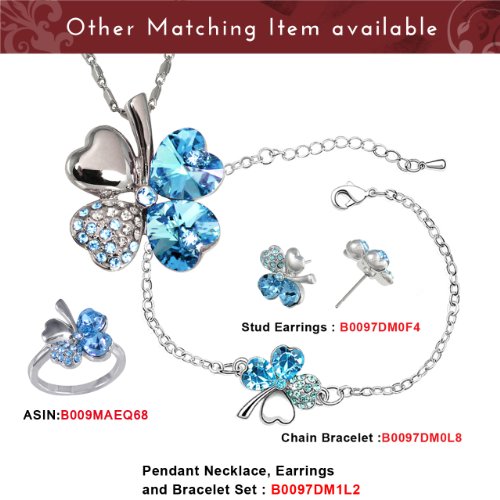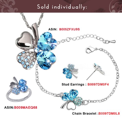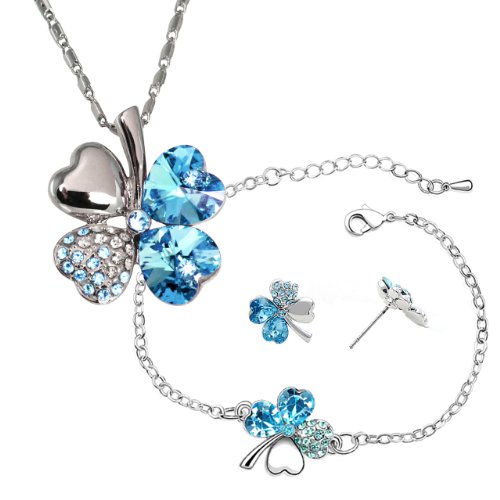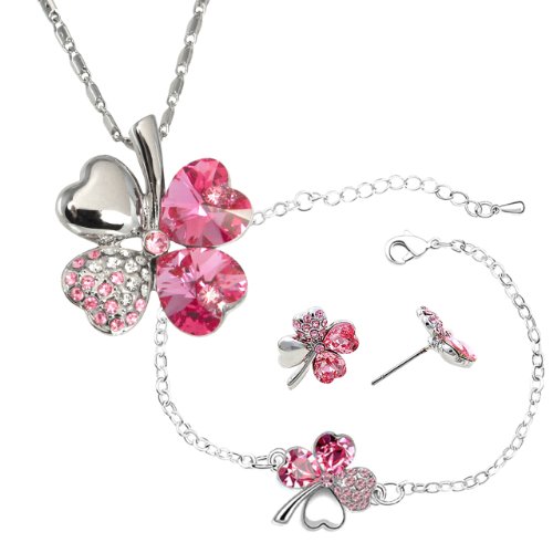 -. Binding : Jewelry -. Brand : Dahlia -. Department : womens -. Feature : Designed with 4 heart shaped clover leaves in wishing best luck to wearers with full heart / Set with heart shaped Swarovski Elements crystals and small Czech rhinestones / Rhodium Plated / Intricate high polish creates glamorous reflections and adds a luxurious look to this set / A beautifully designed jewelry package is included for an impressive gift presentation -. Label : Dahlia -. Manufacturer : Dahlia -. Model : 908257.9937 -. ProductGroup : Jewelry -. ProductTypeName : FASHIONOTHER -. Publisher : Dahlia -. Studio : Dahlia -. Title : Four Leaf Clover Swarovski Elements Crystal Rhodium Plated Necklace, Earrings & Bracelet Set