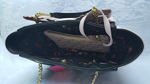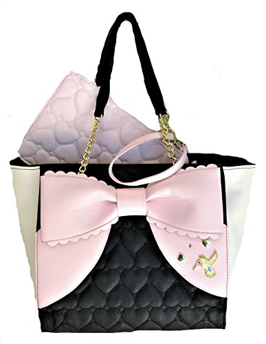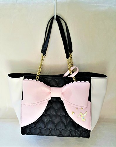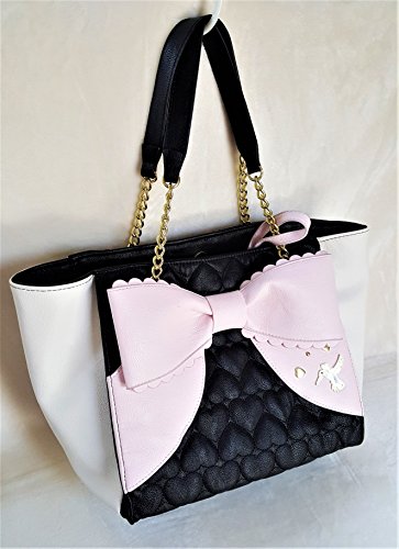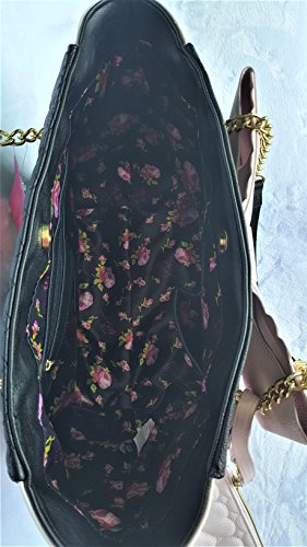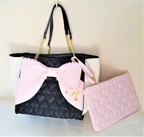 Bag with a Removable Pouch.Overall PU Body w/Quilted Black Front & Back,White on sides.Front has a Big Light Pink Color Bow with goldtone butterfly & heart-shaped studs.Back side Bottom has a gold tone Betsey Signature Name plate.Both Bag & Pouch has Inner Polyester Floral Signature Lining. Closure:Magnetic Snap(Bag),Zipper(Pouch). Dual Chain-Leather Shoulder Strap has 9.5"drop.Bag Measures:Length:(Top:16.5", Bottom:13") x Height:10.5" x Depth: 7.5". Pouch:Length:10" x Height:7"