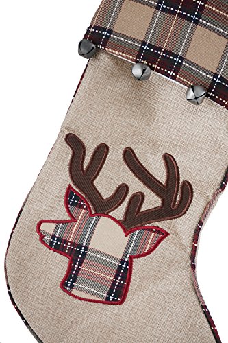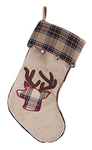 - Features a beige burlap stocking with an embroidered plaid reindeer, jingle bells at the top & a matching cuff