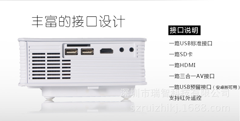 功能:可以插U盘,移动硬盘,SD卡,另配VGA线HDMI线连电脑,三合一AV线连机顶盒、DVD等。