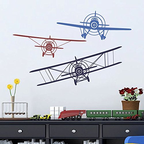 Wall Decal Decor 3 Airplanes Wall Decal - Wall Decals Nursery Boy Biplane Monoplane Wall Decal Boys Kids Room Playroom Decor (navy blue+dark red+medium blue, Medium Set)