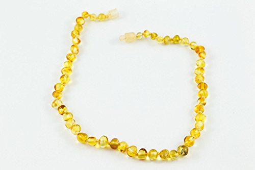 -. Binding : Baby Product -. Brand : Healing Hazel -. EAN : 0859722001976 -. Feature : Handmade with 100% certified Baltic amber / Must be in contact with the skin / May be in contact with plain water, however it is preferable to remove it before bathing or swimming to increase its lifespan / This product has a safety release and is accredited by the Consumer Product Safety Commission / You should be able to run two fingers along your kid's neck under the necklace -. IsAdultProduct : 0 -. Label : Healing Hazel -. Manufacturer : Healing Hazel -. ProductGroup : Baby Product -. ProductTypeName : BABY_PRODUCT -. Publisher : Healing Hazel -. Size : 12-13 inches -. Studio : Healing Hazel -. Title : 100% Certified Balticamber Pop Clasp Children Necklace, Honey Polished, ~12/13'' -. UPC : 859722001976