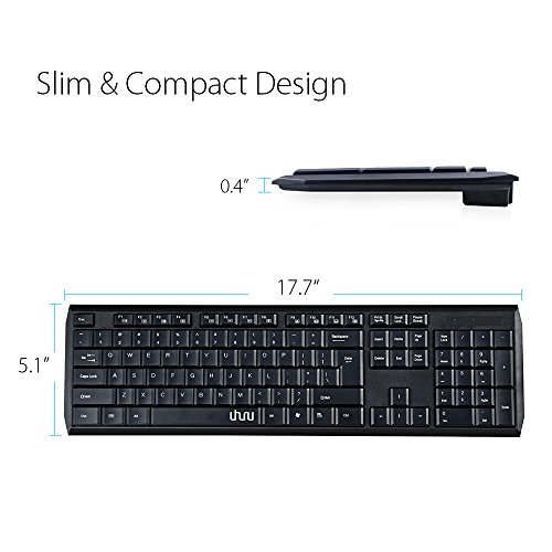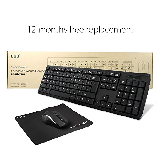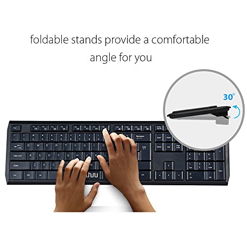 Features: Advanced 2.4 GHz wireless Work or play in more places. The wireless connection virtually eliminates delays, dropouts and interference and gives you a range of up to 10-meters range.* Wireless keyboard The full-size keyboard with number pad, directional keys, and 12 hotkeys is comfortable, convenient. Silky-smooth whisper-quiet keys delight your fingertips. Slim design and optimally angled tilt creates a comfortable and ergonomic typing position. Spill-resistant design handles the unplanned coffee or beverage spill letting you drink and snack without worryAdjustable rear feet for the perfect typing angle Durable keys withstand up to 10 million keystrokes. Compact and smart mouse 3 adjustable DPI levels (800/1200/1600). A single press of the button to customize, and track movements faster or slower at your own discretion. The mouse arc is able to suit your hand better, soft rubber grips for comfortable use Power-save function: automatically sleep with 8 minutes no-operation for saving power, and click any key to wake-up in several seconds. Five button design: Two of which are customizable for a variety of functions also can forward and backward Note Battery life: 18 months for keyboard and 12 months for mouse without changing batteries (Keyboard and mouse battery life may vary based on user and computing conditions) Requires 2 AAA and 1 AA batteries, batteries included, please take out the batteries if you don't use for a long time.Feature