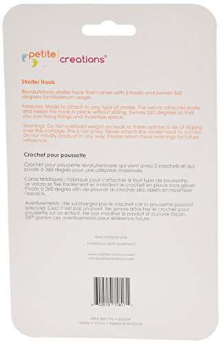 ReleaseDate : 2016-05-31 Studio : Petite Creations Publisher : Petite Creations Binding : Baby Product Product Description Petite Creations Stroller Hook is a revolutionary stroller hook that comes with 2 hooks and swivels 360 degrees for maximum usage. It features velcro that attaches easily to any type of stroller and keeps the hook in place without sliding. Petite Creations is a family run business that looks for unique baby products from around the world. The utmost consideration and emphasis is always on product quality and safety. 0
