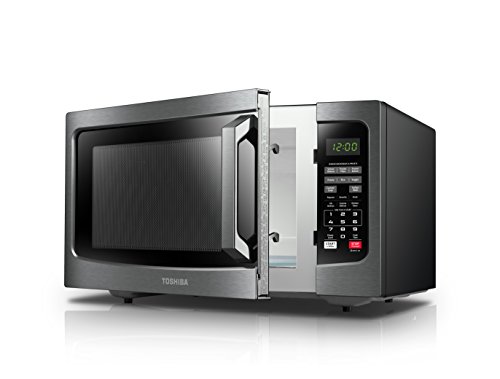 Product Description This Toshiba 1.2 Cubic feet 900 watt Black Stainless Steel microwave is the ideal size for apartment kitchens or office break rooms. Sensor reheating lets you optimally cook six of the most popular food items with the touch of a button. Choose from ten power levels up to 1100 watts. The large digital display has a clock function and can also display a countdown timer as well as the cooking time remaining. Program up to three favorite time and power combinations for additional one-touch convenience. Easily open or close the microwave with the large, easy-to grip door handle. The Black Stainless Steel exterior looks good in any kitchen. 0