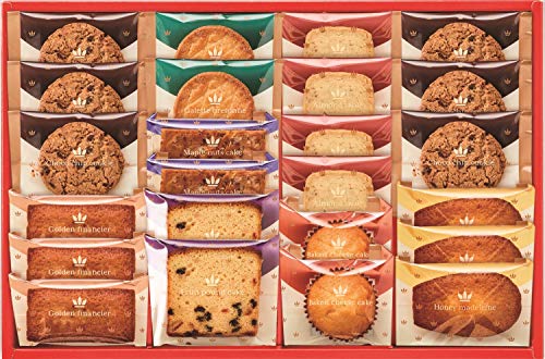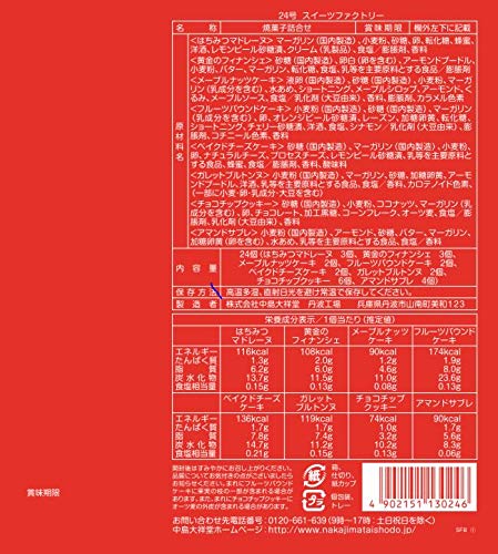 原材料:<はちみつマドレーヌ>マーガリン(国内製造)、小麦粉、砂糖、卵、転化糖、蜂蜜、洋酒、レモンピール砂糖漬、クリーム(乳製品)、食塩/膨脹剤、香料<黄金のフィナンシェ>砂糖(国内製造)、卵白(卵を含む)、アーモンドプードル、小麦粉、バター、マーガリン、転化糖、食塩、乳等を主要原料とする食品/膨脹剤<メープルウォールナッツカップケーキ>液卵(国内製造)、砂糖(国内製造)、小麦粉、マーガリン(乳成分を含む)、水あめ、ショートニング、メープルシロップ、アーモンド、くるみ、メープルソース、食塩/乳化剤(大豆由来)、香料、膨脹剤、カラメル色素<フルーツパウンドケーキ>小麦粉(国内製造)、砂糖(国内製造)、マーガリン(乳成分を含む)、卵、オレンジピール砂糖漬、レーズン、加糖卵黄、転化糖、ショートニング、チェリー砂糖漬、洋酒、食塩、シナモン/乳化剤(大豆由来)、膨脹剤、コチニール色素、香料<ベイクドチーズケーキ>砂糖(国内製造)、マーガリン(国内製造)、小麦粉、卵、ナチュラルチーズ、プロセスチーズ、レモンピール砂糖漬、乳等を主要原料とする食品、蜂蜜、食塩/膨脹剤、香料、酸味料<ガレットブルトンヌ>小麦粉(国内製造)、マーガリン、砂糖、加糖卵黄、アーモンドプードル、洋酒、乳等を主要原料とする食品、食塩/香料、カロテノイド色素、(一部に小麦・卵・乳成分・大豆を含む)<チョコチップクッキー>砂糖(国内製造)、小麦粉、ココナッツ、マーガリン(乳成分を含む)、卵、チョコレート、加工黒糖、コーンフレーク、オーツ麦、食塩/膨脹剤、乳化剤(大豆由来)、香料<アマンドサブレ>小麦粉(国内製造)、アーモンド、砂糖、バター、マーガリン、加糖卵黄(卵を含む)、水あめ、乳等を主要原料とする食品、食塩/香料