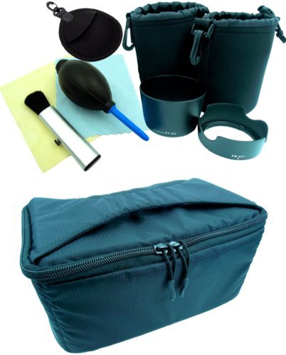 【ROOM28】あると 便利 スターター セット ! キャノン EOS Kiss X7 ダブルズームキット 対応 一眼レフ カメラ レンズ 収納 ポーチ レンズフード ブロアー ブラシ セーム クロス (ダブルズームキット10点+インナーバッグ)