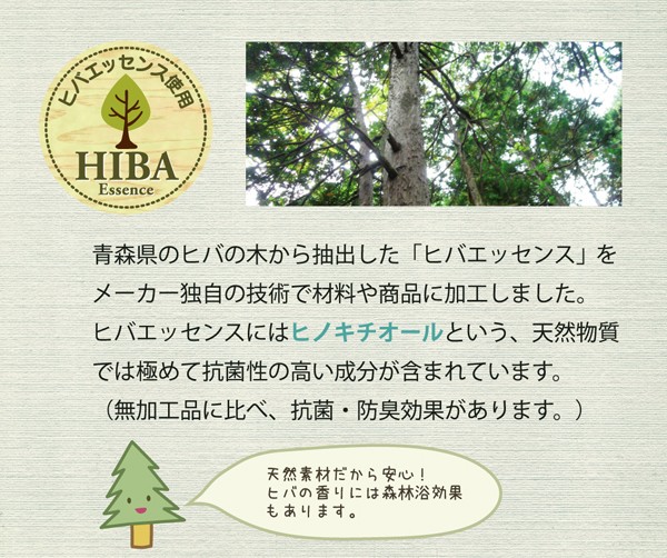 ヒバエッセンス練り込みパイプを使用しています。青森県のヒバの木から抽出した「ヒバエッセンス」をメーカー独自の技術でパイプに加工しました。ヒバエッセンスにはヒノキチオールという、天然物質では極めて抗菌性の高い成分が含まれています。(無加工品に比べ、抗菌・防臭効果があります。)ヒバエッセンスで安らかな森の眠りをご提案します。パイプ使用のため、通気性がよく、熱がこもらず心地よくご使用できます。ファスナー式で中材(パイプ)の交換、高さ(量)の調節が可能です。ご家庭で簡単にパイプが洗えます。