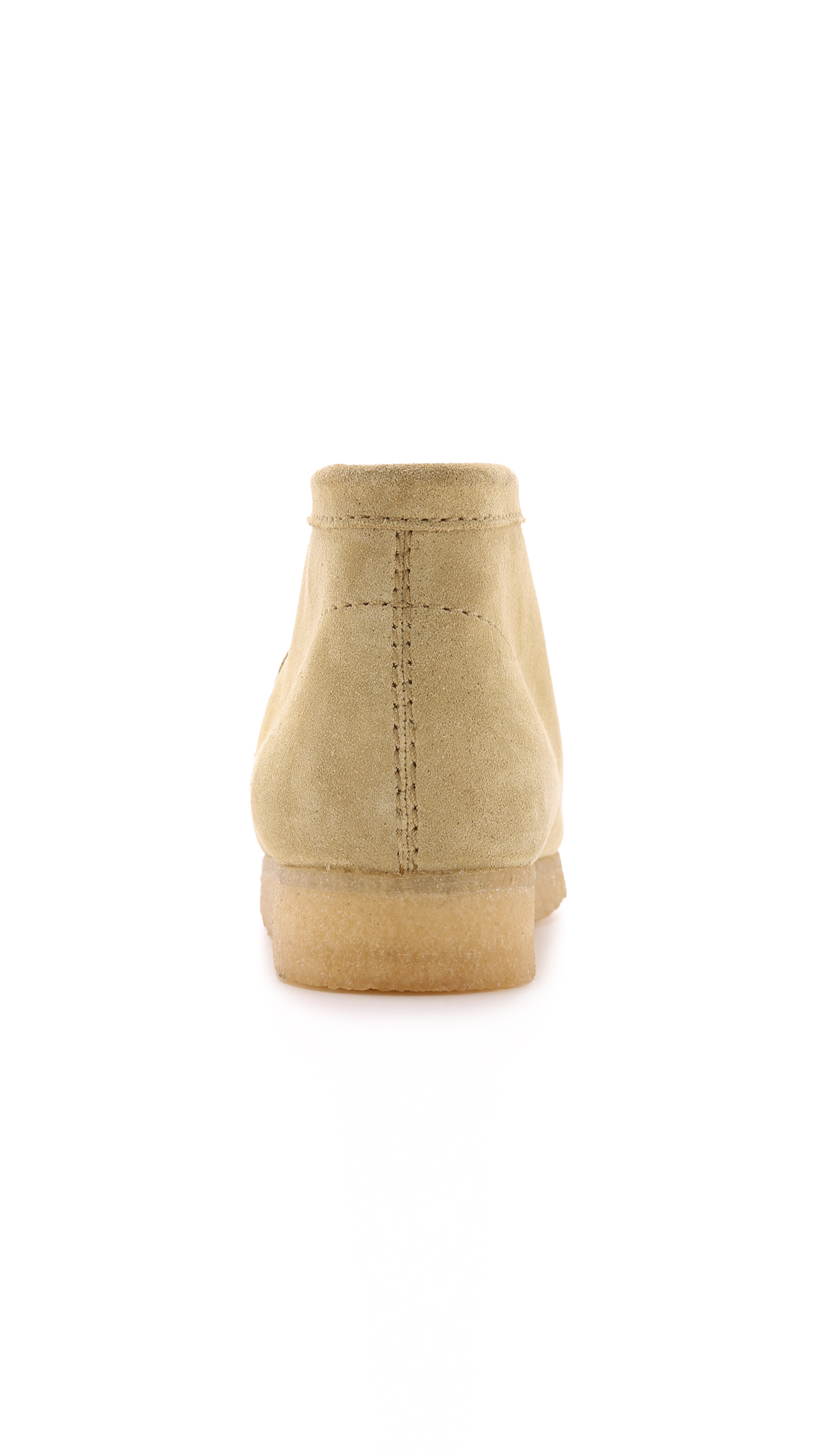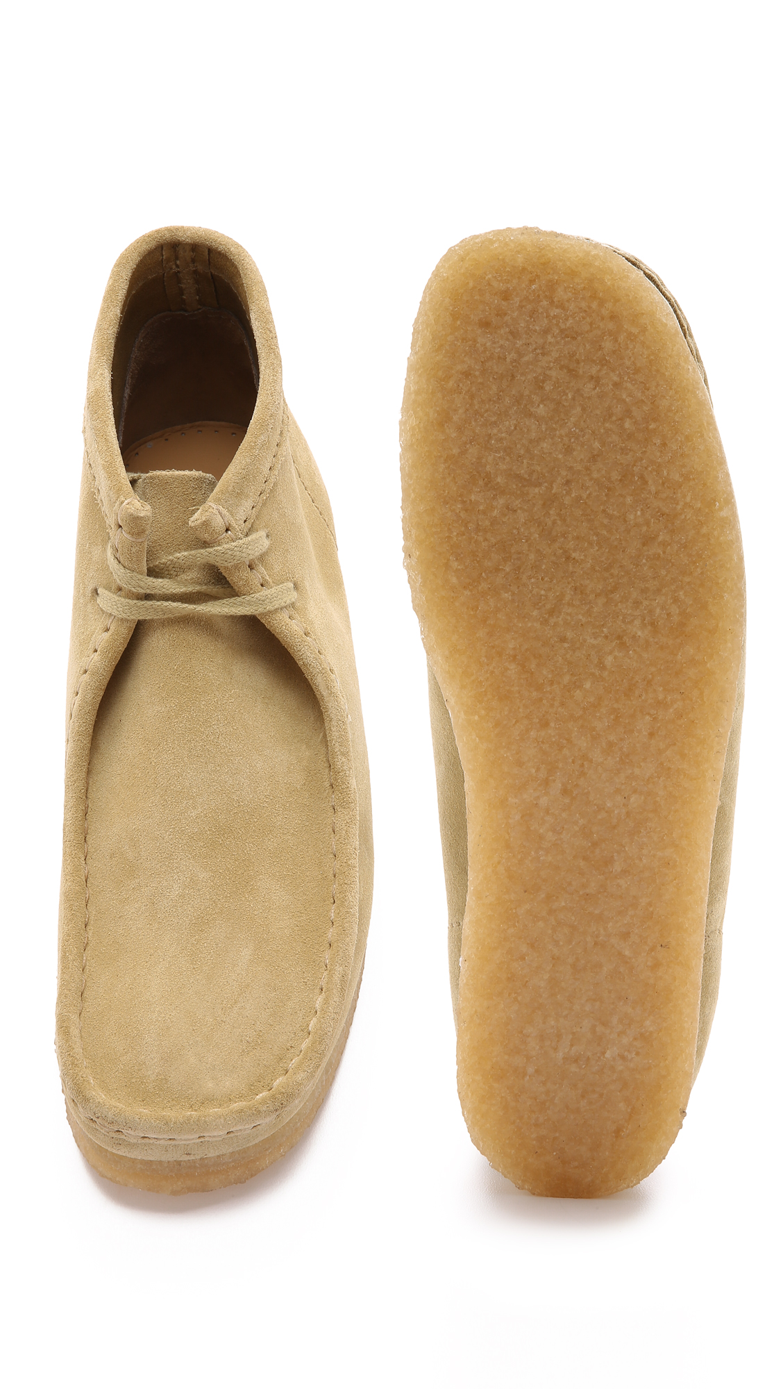 A re-release of the company's '60s moccassin-inspired Wallabee line, these suede Clarks boots have welted edges and a simple lace-up front. Gum sole. Cushion leather insole.