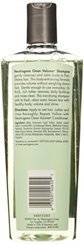 Studio : Neutrogena Publisher : Neutrogena Binding : Health and Beauty Product Description Clean Volume Shampoo gently cleanses and adds body to flat, lifeless hair. This body-enhancing formula provides volume without weighing down hair. Its thick, rich lather removes daily build-up and rinses clean. Leaves hair with healthy body, volume and shine. Has a fresh, clean scent. Non-drying Clean rinsing 0
