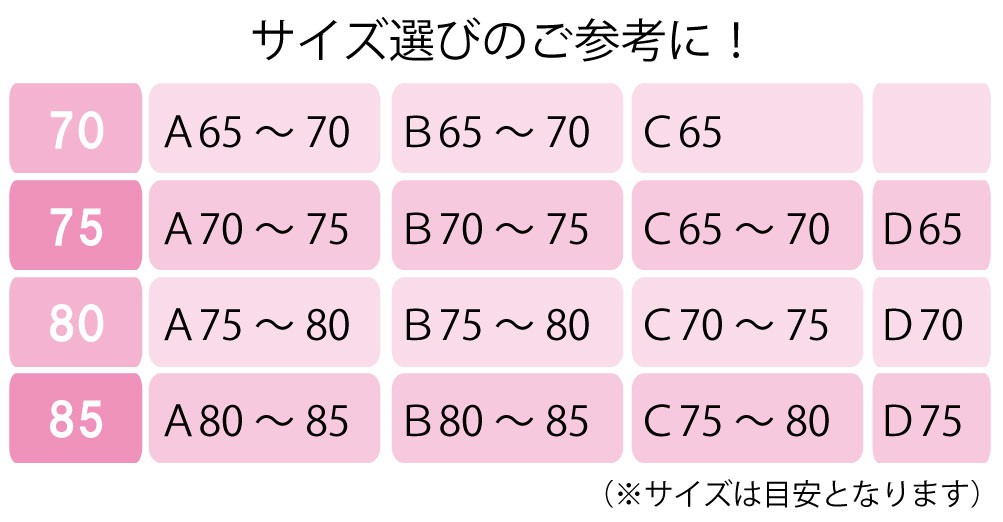 | サイズ | ( 70 ) A65-70 B65-70 C65-70 ( 75 ) A70-75 B70-75 C65-70 D65 ( 80 ) A75-80 B75-80 C70-75 D70 |