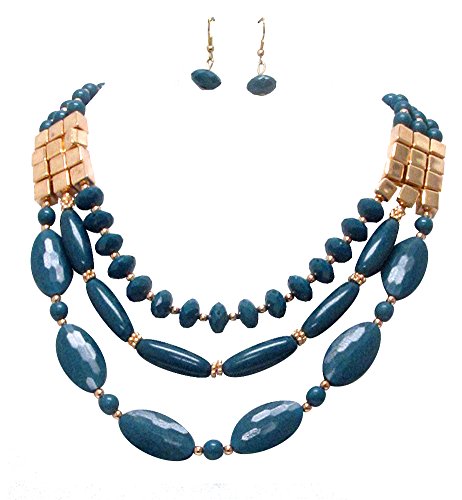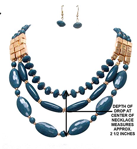 Nicely chunky three strand beaded necklace in a darkish teal blue/green with round, knobby textured and cube shaped accent beads in gold-tone.The necklace measures 18 inches in length, with an additional 3 inches of wearable length available via extender chain. The depth of drop at the center of the necklace measures approximately 2 ½ inches (see second photo).