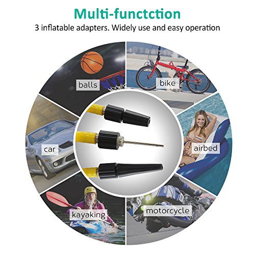 [MULTIPLE USES]: This tire pump comes with 3 inflatable adapters. So it is widely used for cars, bikes, motorcycles, RV, SUV, ATV and truck, sports equipment and inflatables.
