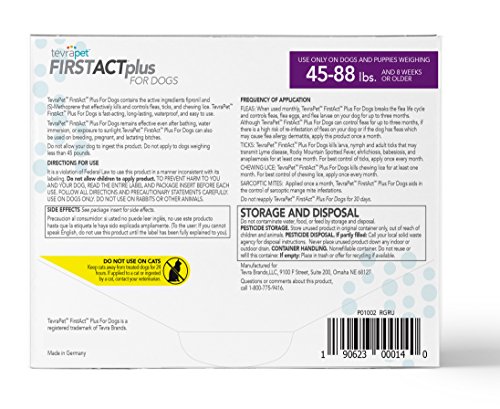 Studio : Tevra Brands Publisher : Tevra Brands Binding : Misc. Product Description TevraPet First Act Plus for dogs kills fleas, flea eggs and larvae, and chewing lice. Kills all stages of ticks including those that may transmit Lyme disease. Aids in the control of sarcoptic mange. TevraPet First Act Plus topical contain the same active ingredients (fipronil (S)-methoprene) as FRONTLINE Plus for dogs, but costs less. 0