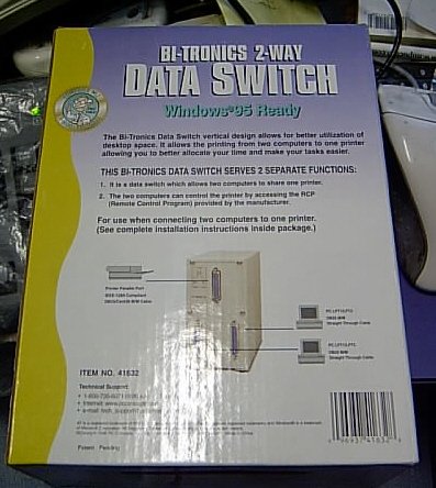 It is a data switch which allows two computers to share one printer. OR ONE COMPUTER TO SHARE 2 Printers, scanners, Zip, etc.