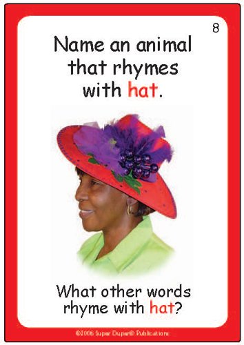 -. Binding : Toy -. Brand : Super Duper® Publications -. EAN : 9791586506611 -. Feature : 56 photo cards (2 1/2" x 3 1/2") - 28 card pairs match photo/rhyming challenges (e.g., Name an animal that rhymes with cake.) with photo/word answers (e.g., snake) / Includes storage tin and content cards. / Educational - Helps children identify and produce rhyming words / Over 30 Super Duper Publications Apps available on the Amazon Appstore for Android / You might also enjoy our "Auditory Memory for Rhyming Words in Sentences" Fun Deck Cards - also available on Amazon -. IsAdultProduct : 0 -. Label : Super Duper® Publications -. LegalDisclaimer : not a dangerous product. -. Manufacturer : Super Duper® Publications -. MPN : FD-94 -. PackageQuantity : 1 -. PartNumber : FD-94 -. ProductGroup : Toy -. ProductTypeName : TOYS_AND_GAMES -. Publisher : Super Duper® Publications -. Studio : Super Duper® Publications -. Title : Auditory Rhyme Time Fun Deck Cards - Super Duper Educational Learning Toy for Kids