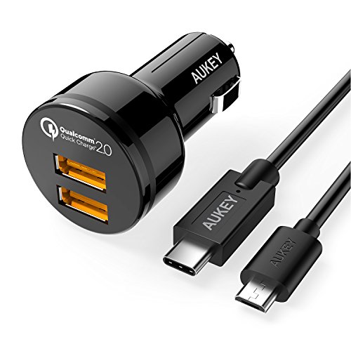 Package Contents: AUKEY 36W 2 Port USB Car Charger Compatible with Qualcomm Quick Charge 2.0 (Dual Turbo Charge Port), 20AWG 3.3FT USB Micro USB Cable, User manual, and full 24 Month Worry-Free Warranty